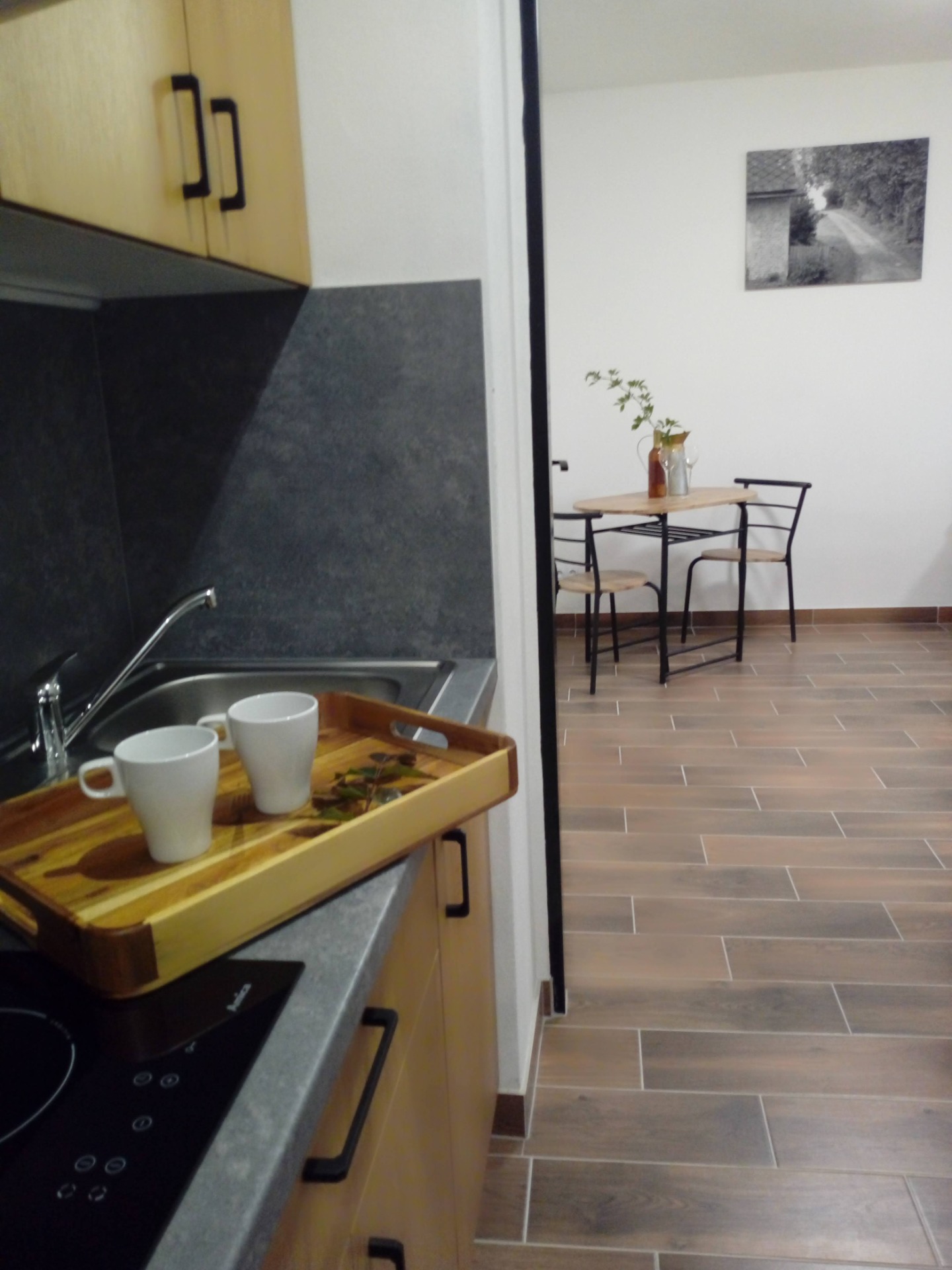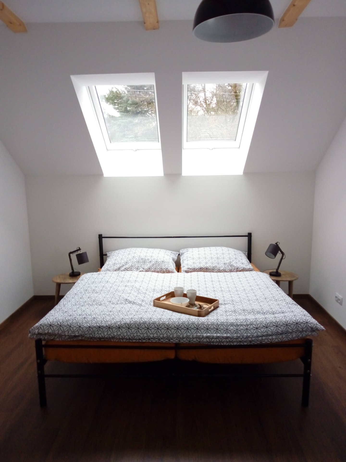 Manželská postel, vlastní sociální zařízení, možnost využít kuchyňskou linku na chodbičce před pokojem.